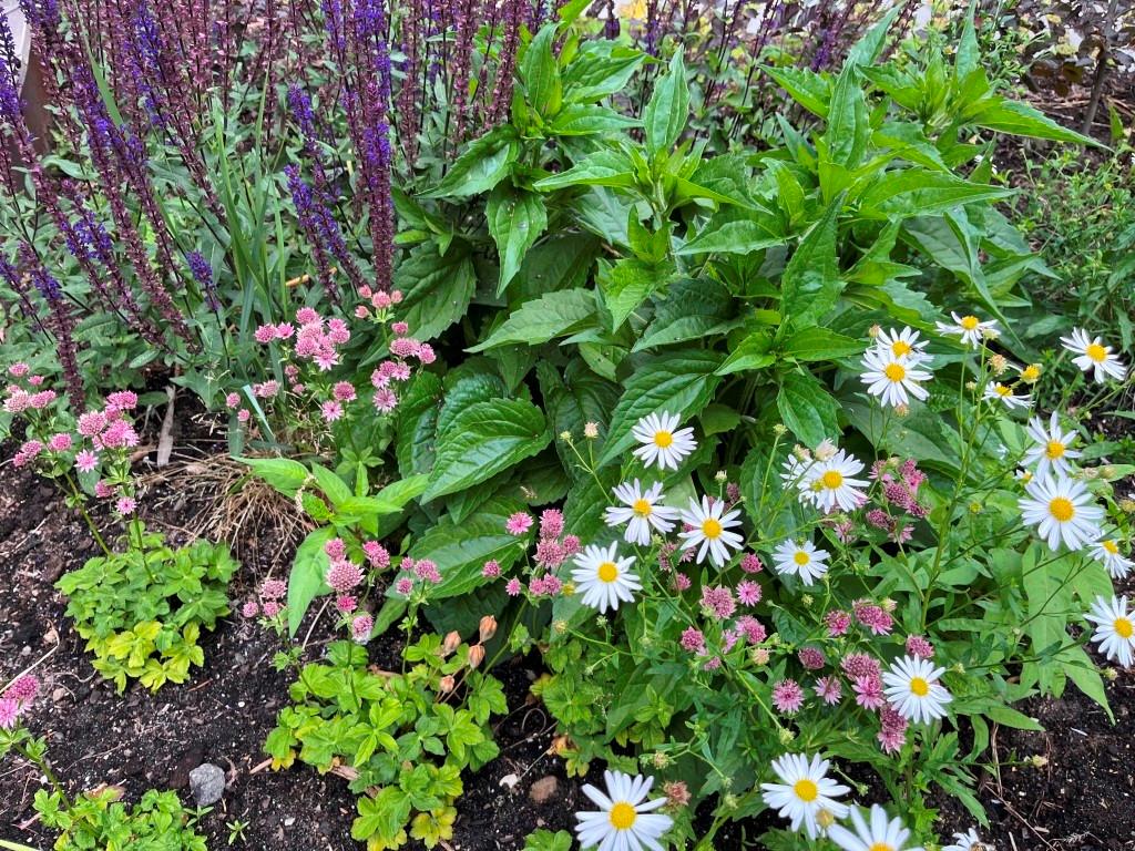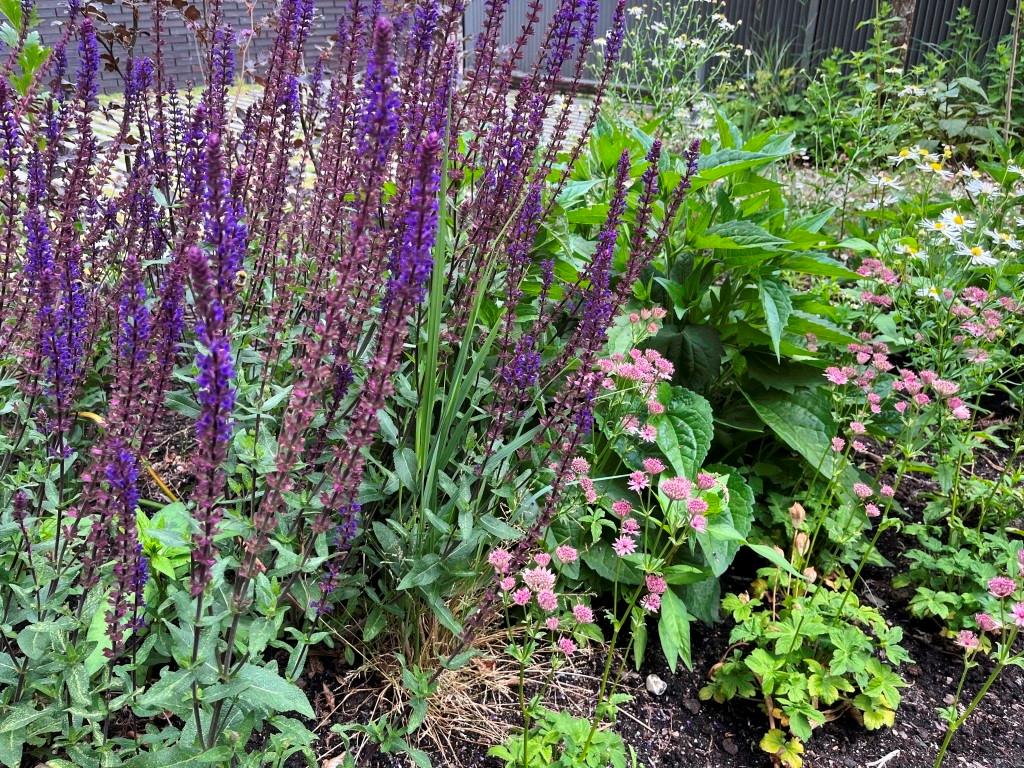 Op de foto’s zie je Salvia, Astrantia en Erigeron. De roodbladige beukenhaag is nog jong, deze zal over een tijdje een halfhoge groene ‘muur’ vormen. Ook de blauwe regen en Clematis die over de pergola gaan groeien zijn nog klein. De foto’s zijn genomen in de tweede zomer.