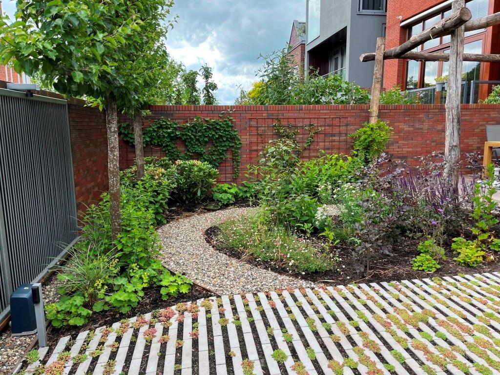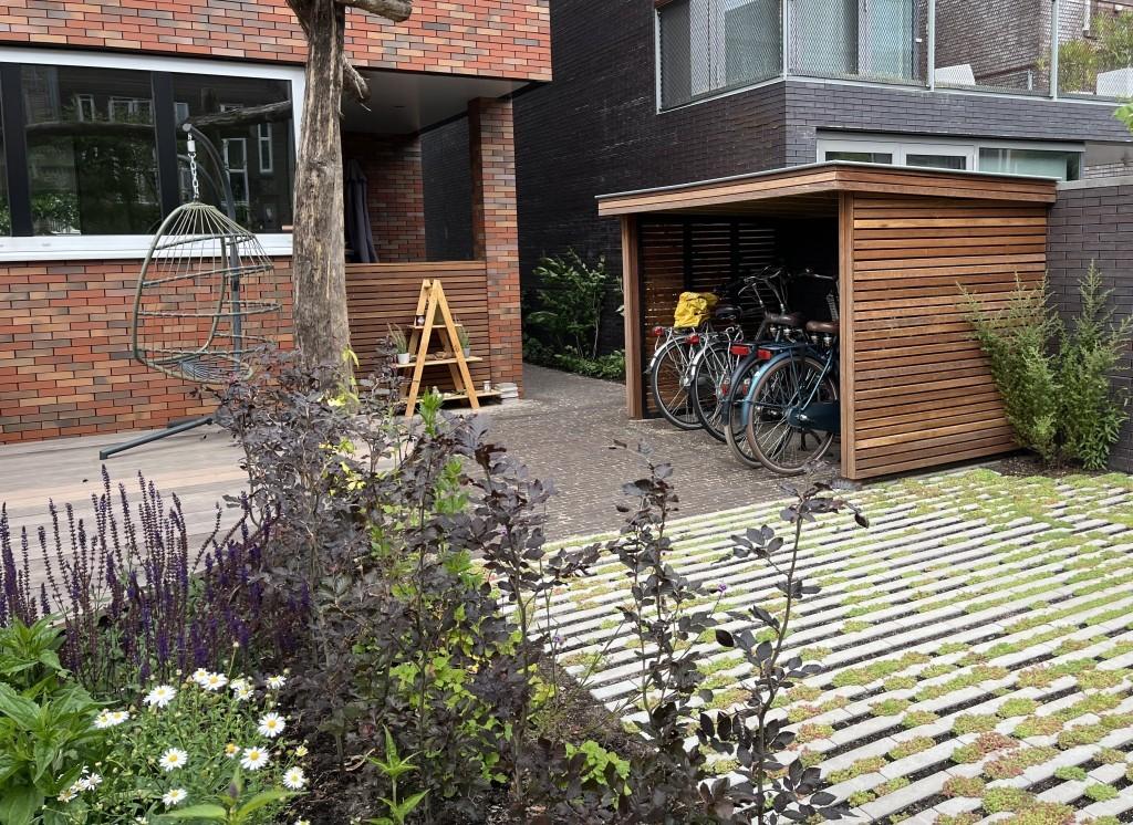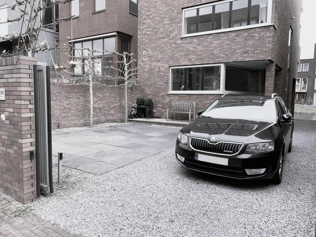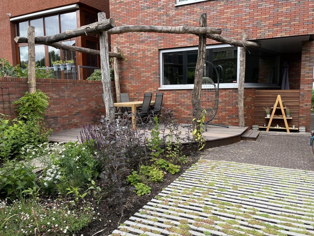 Waterdoorlatend en natuurvriendelijk, deze voortuin met terras, oprit en fietsenberging.