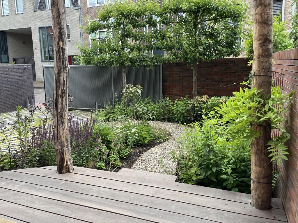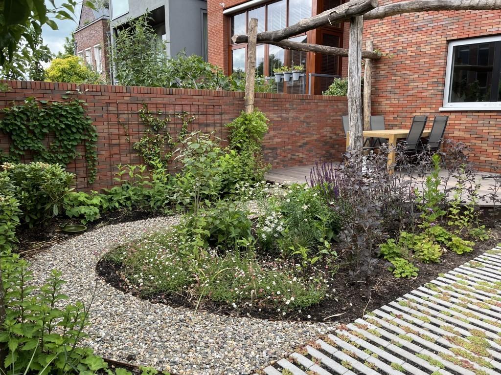 Tegen het huis aan ligt een rond vlonderterras. De leibomen en de pergola zorgen voor privacy en een beschutte sfeer. Tussen het zitgedeelte en de parkeerplaats staat een ronde beukenhaag die de auto aan het zicht zal onttrekken. Er loopt een rond pad door de tuin, zodat je tussen de planten door kunt lopen. Er is een open berging met groen dak voor de fietsen. Achter de houten latten op de hoek van het huis zijn de afvalcontainers onzichtbaar weggewerkt.