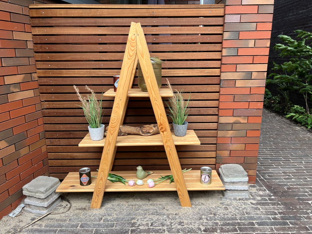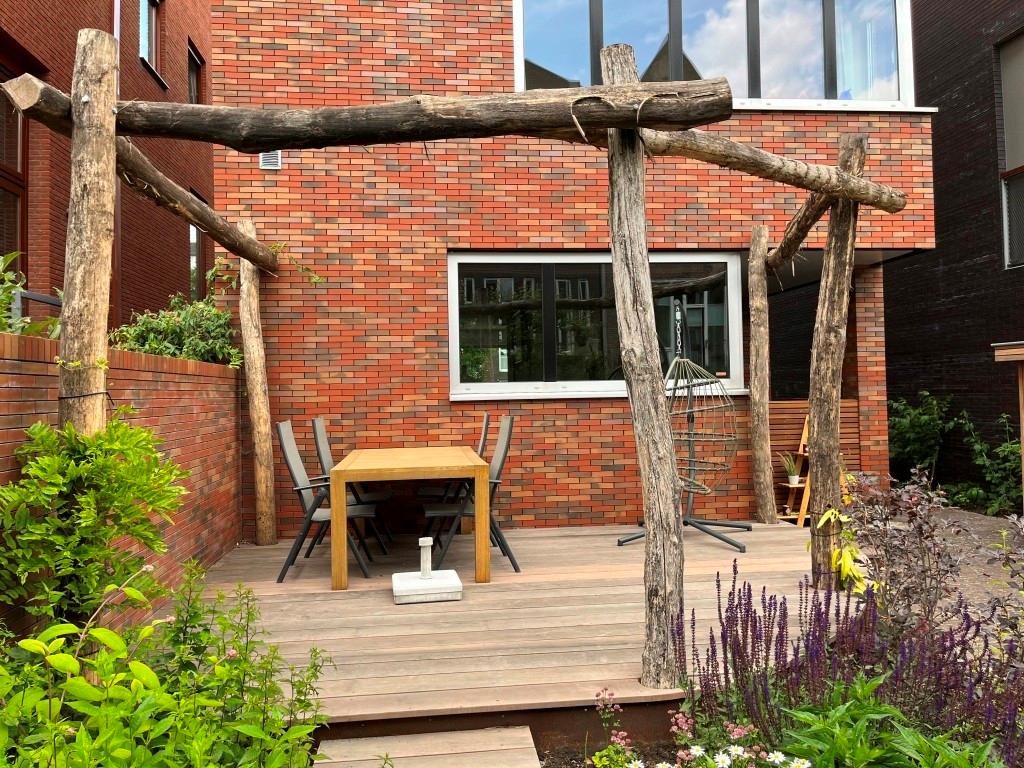 De opvallende pergola heeft een lekker informele sfeer. Deze is van grillig robiniahout, Europees hardhout.
