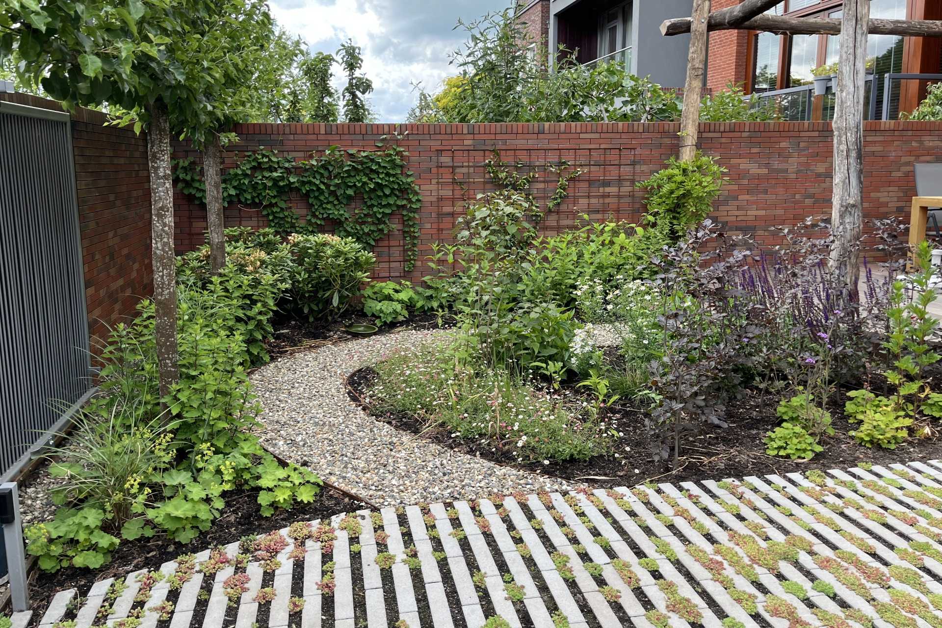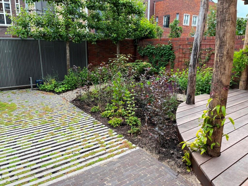 Hoe krijg je een gezellige tuin, als daar ook een parkeerplaats en een fietsenberging in moeten? Deze stadstuin ligt aan de straatkant, en is zowel een zitplek als een oprit. In de oude situatie was het een tegeltuin met een oprit van grind. De huidige bewoners wilden dat graag omtoveren tot een prettige zitruimte, liefst duurzaam en natuurvriendelijk.