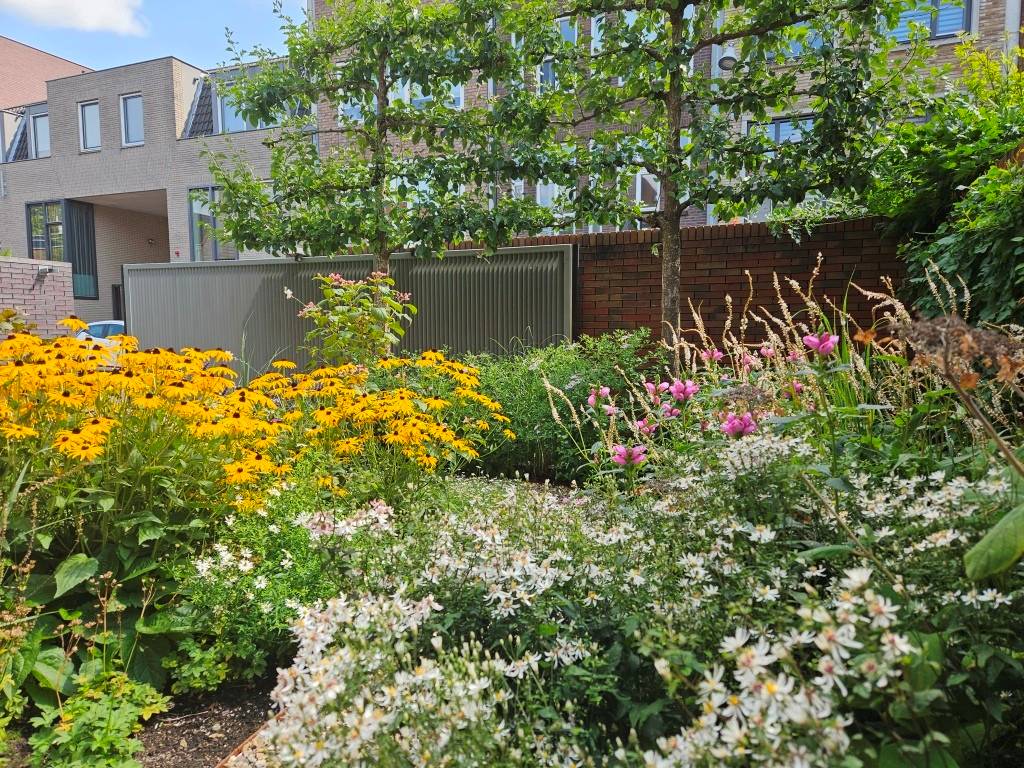 We zijn erg blij met het ontwerp van onze tuin. Omdat aan de andere kant water ligt, heeft deze tuin veel functies: fietsenstalling, parkeerplaats, berging. Wat we misten was een fijne plek om zelf te ontspannen en die ook ruimte zou bieden aan de natuur. Gonda van Vicas Tuinontwerpen heeft onze vele wensen vertaald in een verrassend en mooi ontwerp. De nieuwe tuin heeft een grote aantrekkingskracht op hommels, bijen en andere insecten. En behalve eksters weten nu ook mezen, merels en roodborstjes onze tuin te vinden. Zelf genieten we van wat elk seizoen te bieden heeft en zitten we op mooie dagen graag buiten. En doordat het veel vaste planten zijn, valt het onderhoud erg mee.